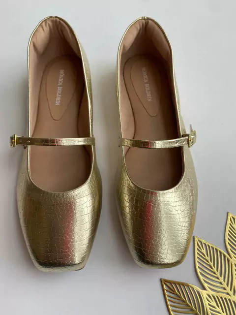 Sua cor dourada é neutra e ela possui textura por toda a sapatilha, deixando o modelo mais elegante.
